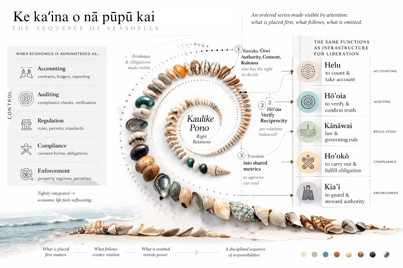 Sequence of the Seashells comes from a proposal written for a workshop in Hawaiʻi, and as part of any decolonial program, utilizes the naming of these events in the language of the locale, in this case,ʻŌlelo Hawaiʻi.